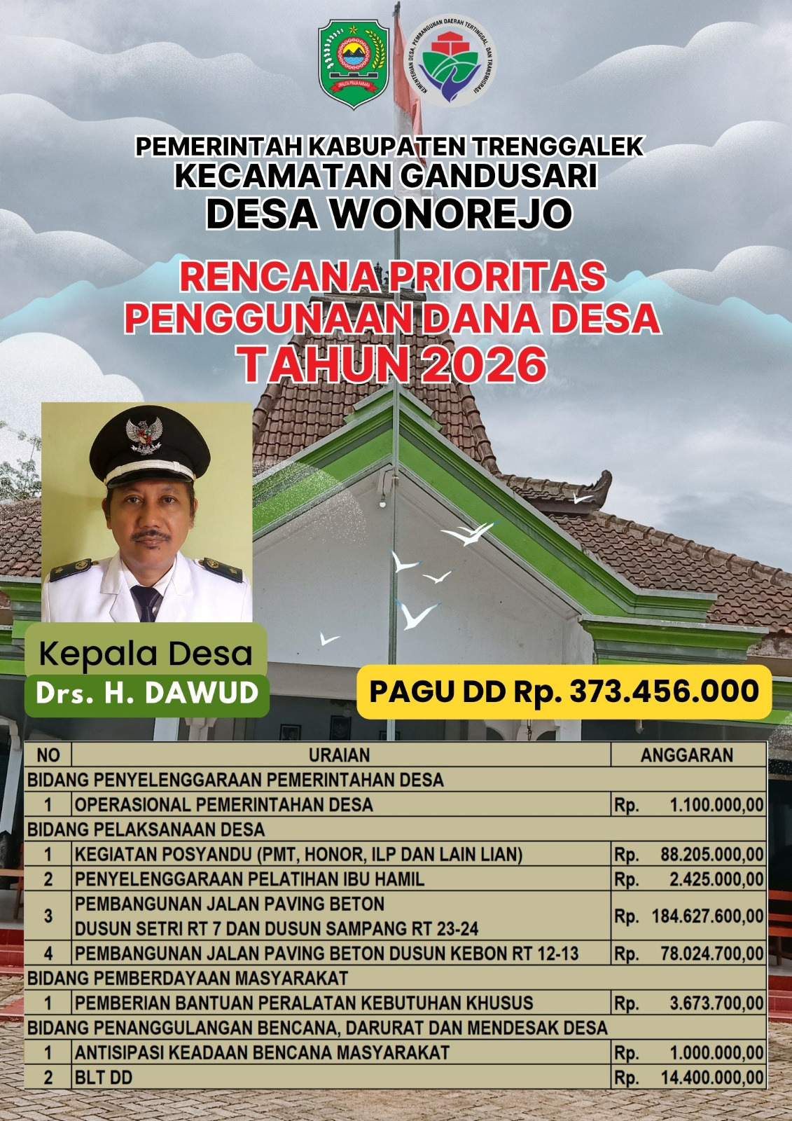 Adapun Pagu Dana Desa Tahun Anggaran 2026 yang diterima oleh Desa Wonorejo adalah sebesar: