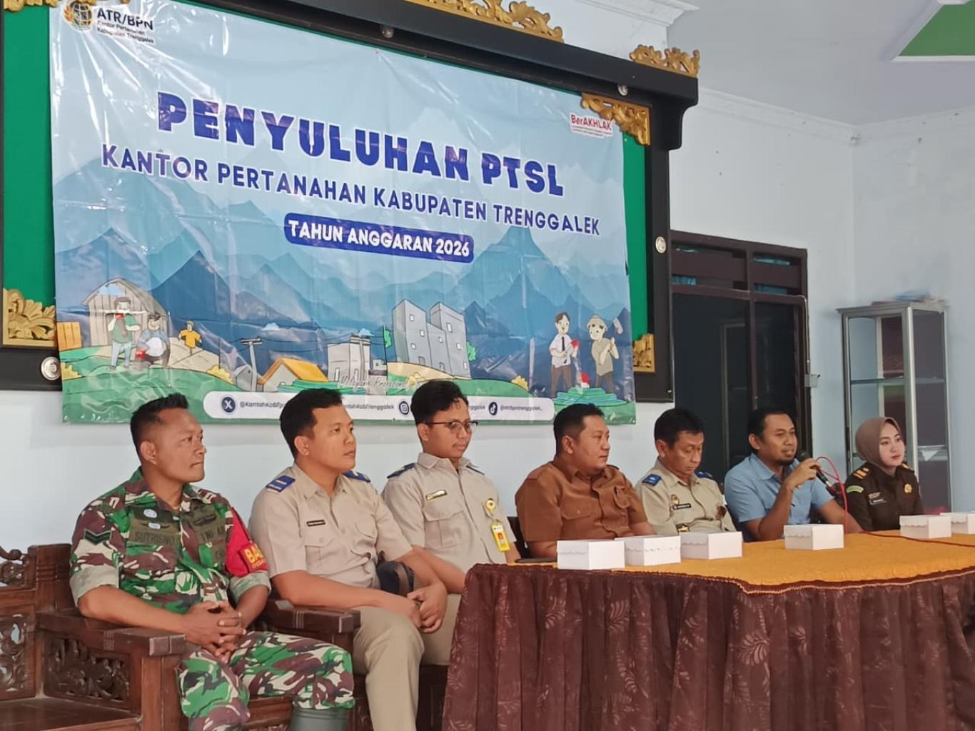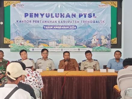 Badan Pertanahan Nasional (BPN) Kabupaten Trenggalek menyelenggarakan kegiatan Penyuluhan Program Pendaftaran Tanah Sistematis Lengkap (PTSL) Tahun Anggaran 2026 yang bertempat di Balai Desa Wonorejo pada hari ini pukul 09.00 WIB.